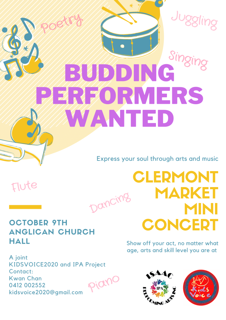 IPA and KidsVoice2020 are looking for budding artists to perform in our upcoming Sunday Mini Market Concerts!